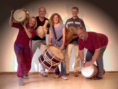 Dorothee Marx, Heike Gruber, Georg Simon, Jürgen Fischer und Rainer Redeker präsentieren ein buntes Kaleidoskop von Rhythmen und Instrumenten aus Guinea, Ghana, Benin, Kuba, Brasilien, Haiti und vielen anderen Ländern
